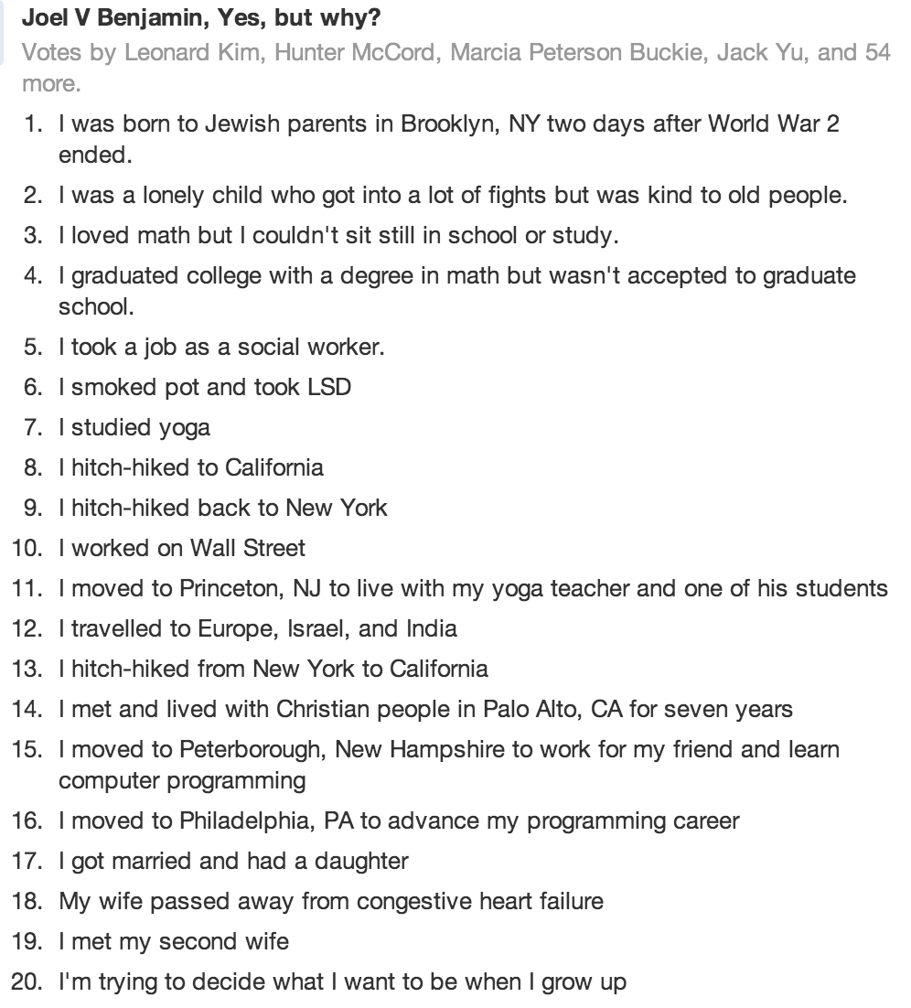 Quora users were asked to share their life story in twenty lines, and I thought this would be a great practice for my pre-intermediate classes. Asking them to create a story to practice the past simple can be difficult for some learners as not everyone is a natural storyteller, but everyone has lived a life. It’s also an opportunity for them to try out the tense in short sentences without having to worry about too much content.