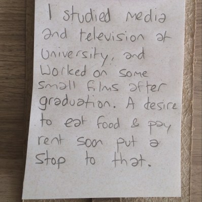 Errr, I don’t really have any. Can’t sing, can’t dance, can’t paint, can’t make anything. I’m a pretty good cook, but that’s about it,