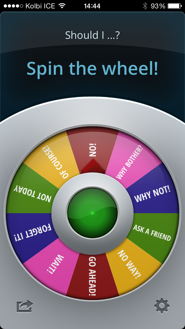 This app is designed to help you make decisions by taking it out of your hands and leaving it to the spin of a wheel. With the wheel below the students could complete the question “Should I…?” with their own language before spinning the wheel and getting their answer.