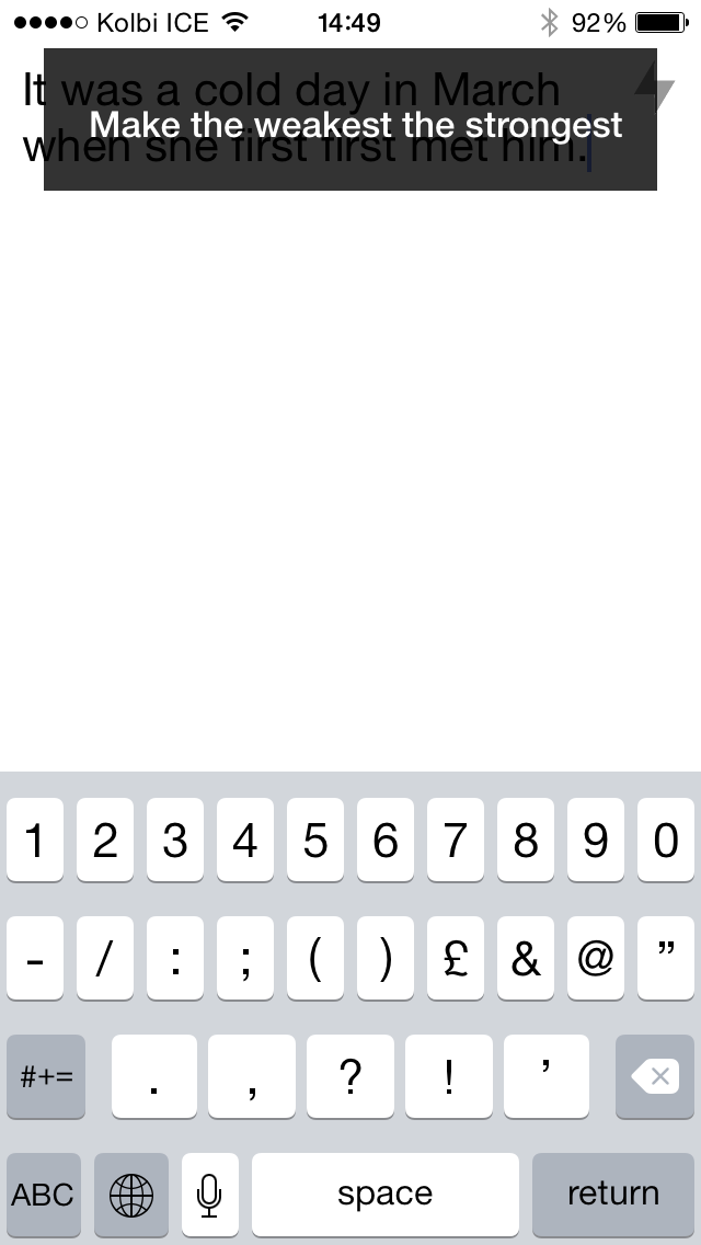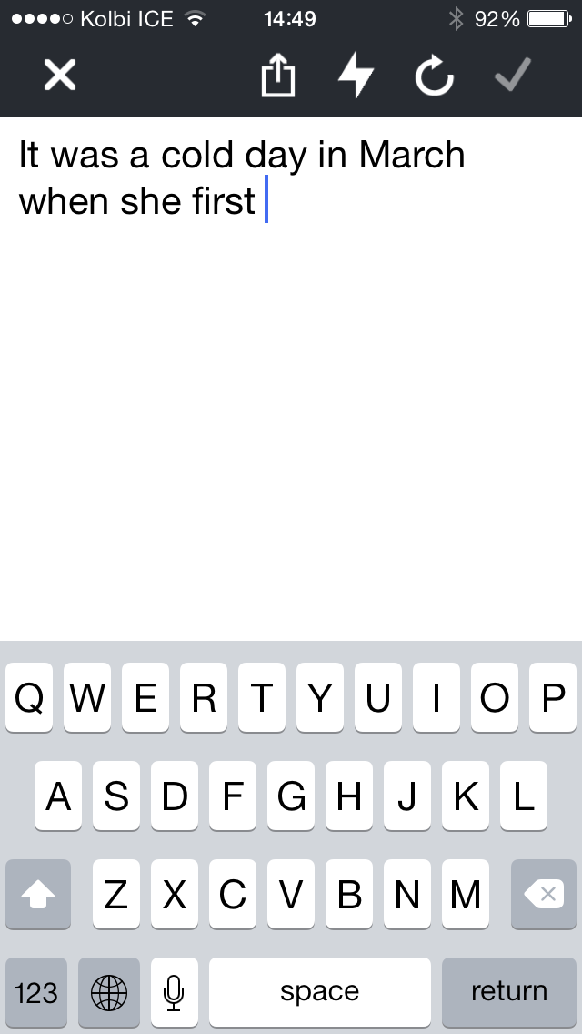You continue to write until inspiration dries up. You can then ask the app to help you by pressing the thunderbolt icon at the top of the screen. It will then give you a random question or statement to encourage you to think in a different way, hopefully giving you the kickstart you need to continue.