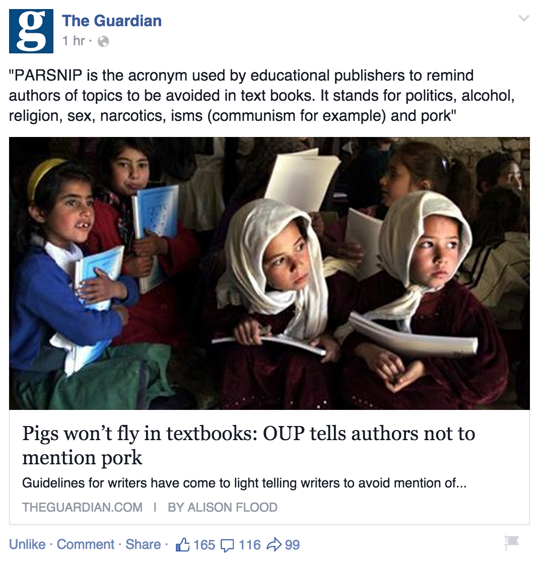 *Just as I was about to post this, the most high profile example of ELT and small p politics I’ve ever seen was posted on the Guardian Facebook page.